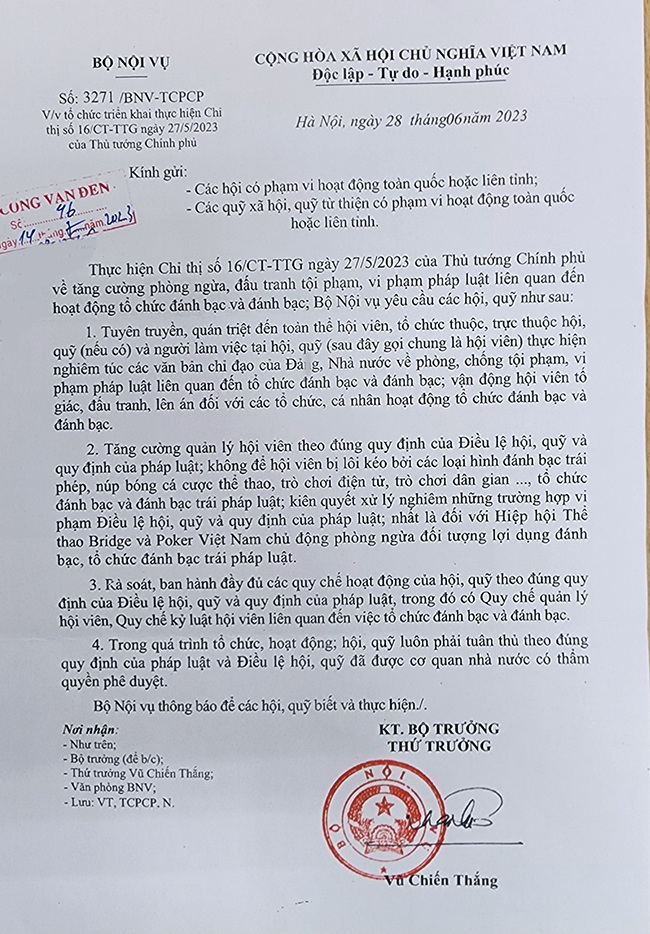 Bộ Nội vụ vừa có công văn số 3271/BNV-TCPCP gửi các Hội, các quỹ xã hội, quỹ từ thiện có phạm vị hoạt đọng toàn quốc hoặc liên tỉnh về việc tổ chức triển khai thực hiện Chỉ thị 16/CT-TTg ngày 27/5/2023 của Thủ tướng Chính phủ.