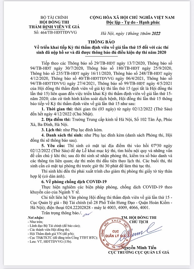 Hội Thẩm định giá Việt Nam vừa ra thông báo về việc triển khai Kỳ thi thẩm định viên về giá lần thứ 15 đối với các thí sinh đã nộp hồ sơ và đã được thông báo đủ điều kiện dự thi năm 2020.