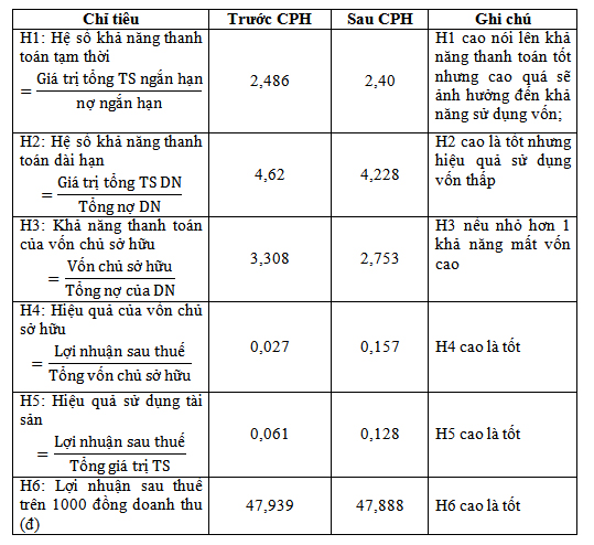 Biểu số 2: Các chỉ tiêu tài chính sau CPH so với trước khi CPH