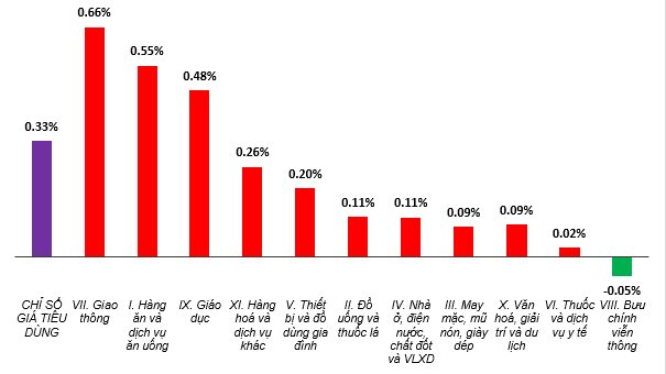 - Nhóm giao thông tăng mạnh nhất với 0,66% (tác động làm CPI chung tăng 0,06 điểm phần trăm), chủ yếu do: Giá dầu diezen tăng 2,27%; giá xăng trong nước tăng 0,98% do ảnh hưởng của các đợt điều chỉnh giá trong tháng.
