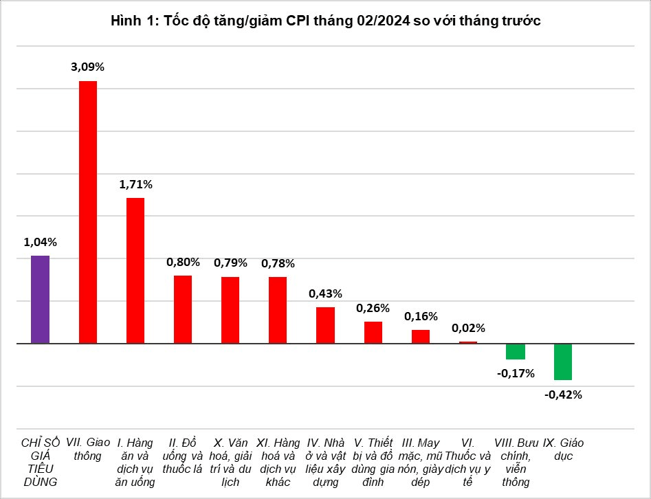 CPI tháng 02/2024 tăng 1,04% (khu vực thành thị tăng 0,98%; khu vực nông thôn tăng 1,09%). Trong 11 nhóm hàng hóa và dịch vụ tiêu dùng chính, có 9 nhóm hàng tăng giá, 2 nhóm hàng giảm giá.