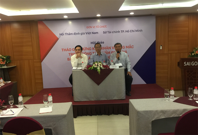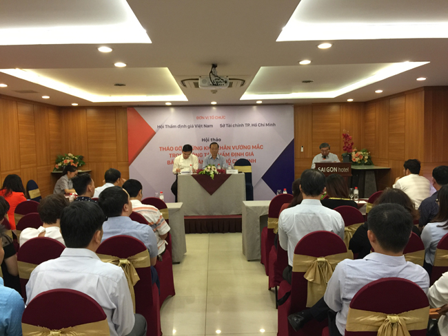 Những ý kiến vướng mắc trong công tác thẩm định giá bất động sản của các đơn vị thẩm định giá thuộc địa bàn TP.HCM được đại diện Ban nghiên cứu khoa học thẩm định giá thuộc Hội TĐGVN tổng hợp trình bầy và được khá nhiều đại biểu tham dự Hội thảo phát biểu bổ sung, làm rõ thêm những vướng mắc; Sau đó Ông Phạm Đăng Hưng – Phó trưởng Ban vật giá Sở Tài chính TP HCM đại diện Sở Tài chính TP. HCM đã trao đổi, giải đáp những vướng mắc mà các doanh nghiệp thẩm định giá nêu ra và hướng dẫn các doanh nghiệp các quy trình, thủ tục báo cáo hồ sơ thẩm định giá với Hội đồng thẩm định giá tài sản Thành phố.