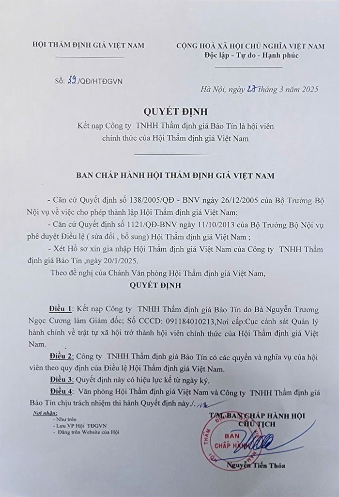 Quyết định kết nạp Công ty TNHH Thẩm định giá Bảo Tín là hội viên của Hội Thẩm định giá Việt Nam Hội viên 28/03/2025 0 Chia sẻ: Viết bình luận của bạn: Gửi bình luận