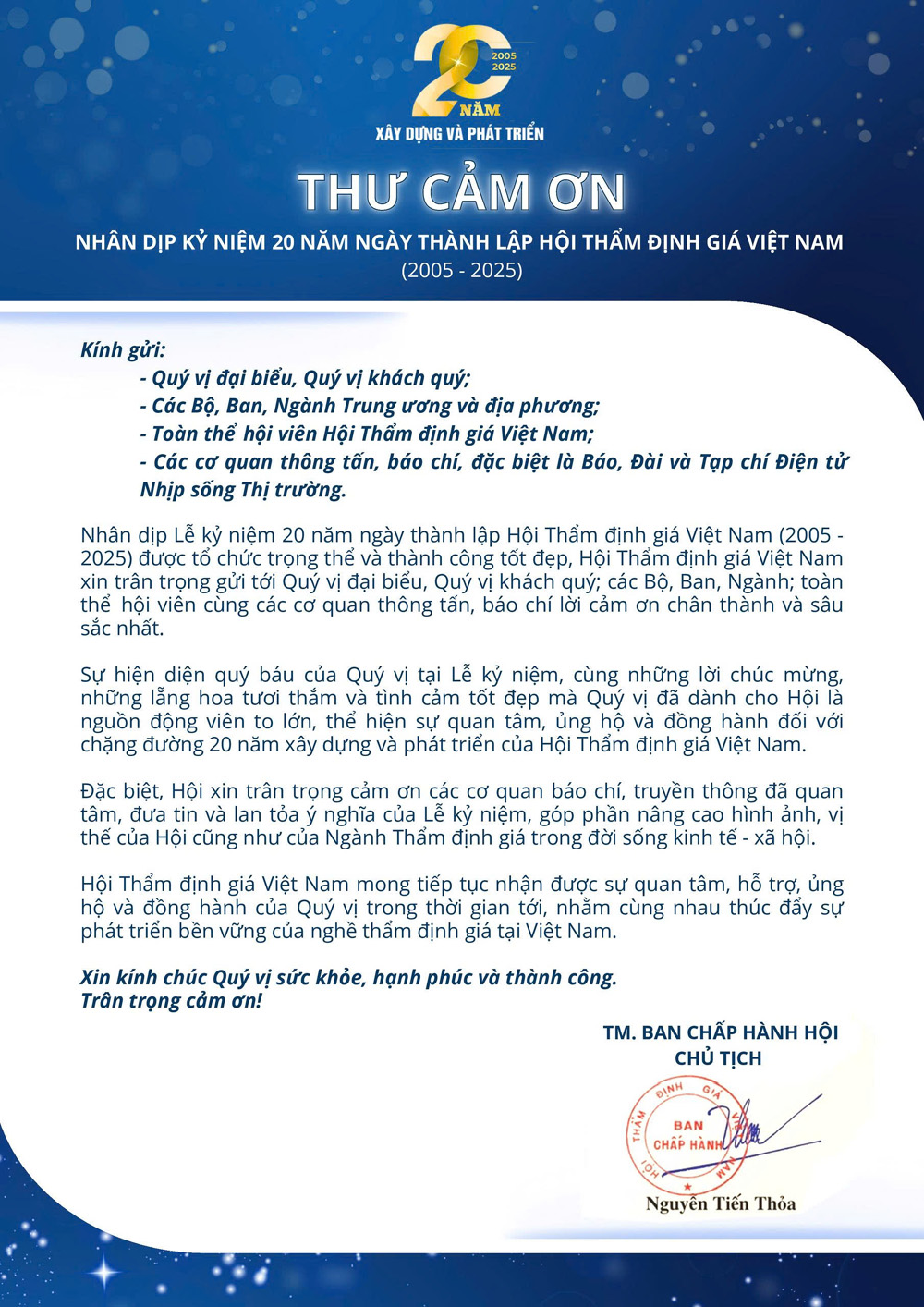 Thư cảm ơn nhân dịp Lễ Kỷ niệm 20 năm ngày thành lập Hội Thẩm định giá Việt Nam (2005-2025) Tin tức 29/12/2025 0 đào tạo chứng chỉ thẩm định giá học thẩm định giá ở đâu lớp học thẩm định giá Luật Đất đai thẩm định giá thẩm định giá đất đai thẩm định giá dịch vụ thẩm định giá dịch vụ công thẩm định giá tài sản Chia sẻ: Viết bình luận của bạn: Gửi bình luận