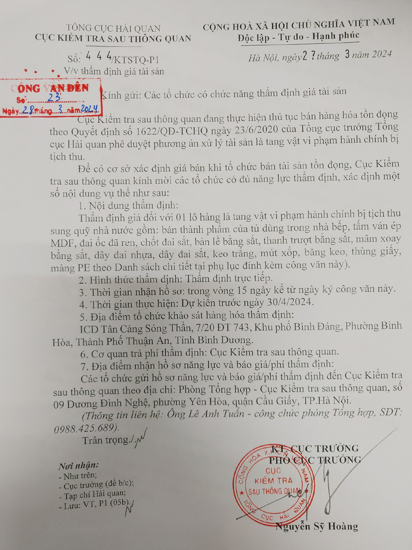 Thư mời thẩm định giá tài sản của Cục Kiểm tra sau thông quan – Tổng Cục Hải quan